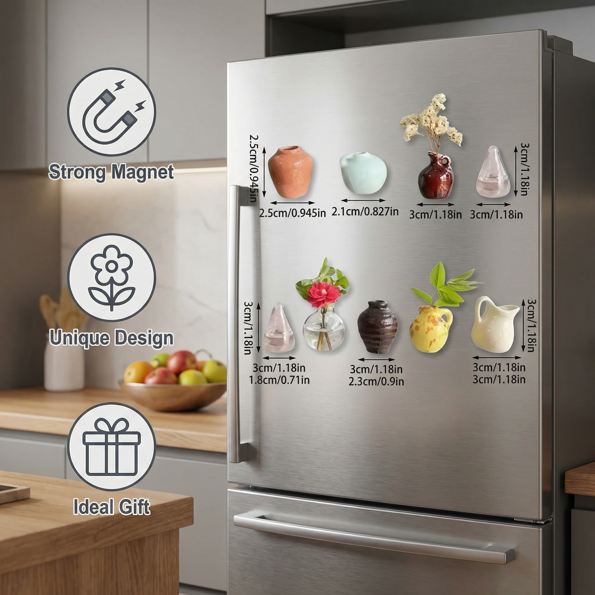 These vases are a great way to display small flowers without taking up much space. The magnet is strong enough to keep them in place.